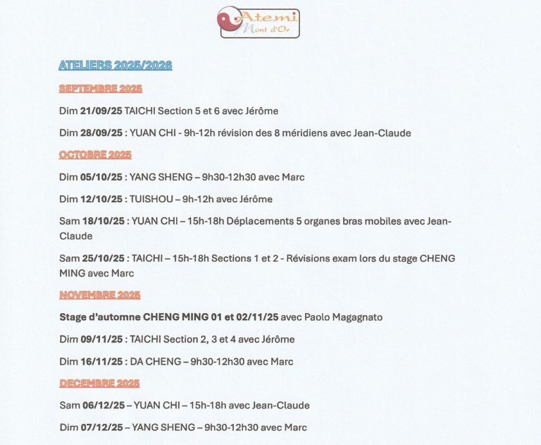 A.T.E.M.I (Arts, Techniques Energétiques Martiales Internes) est une association sous loi 1901 dont l’origine remonte à 1993. Enregistrée à la préfecture du Rhône sous le n° W691074314 et n° Siret 522 614 361 00015.